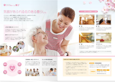パンフレット 4ページ 介護施設 (パンフレット/入居・施設案内) 本文の文字サイズを大きめにしたデザインで 入居者やそのご家族も読みやすいように配慮しました。 ロゴに合わせた桜の画像でブランド感を演出します。 コンセプトをチャートで表現。 平面図をもとに描き起こします。 表紙/裏表紙 中 面