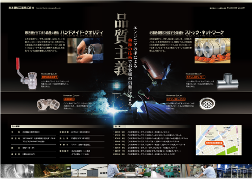 パンフレット 4ページ 製造業 (パンフレット/会者案内) 品質の高さを感じさせる「黒」をベースに 見出しの書体を明朝系にすることで 高品質であることを視覚的に訴求します。 縦書きのキャッチが質実剛健な雰囲気を演出。 金属の質感を表現したデザイン。 表紙/裏表紙 中 面