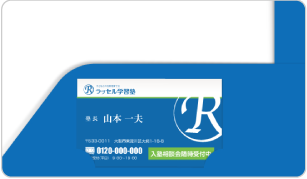 ポケット付きフォルダ 学習塾 (ポケット付きフォルダ) 保護者の方に複数枚の資料をお渡しする場合に大変便利なのがポケット付きフォルダです。 名刺ポケット付きなので更に便利です。 コンセプトを表紙で訴求します。 中面には名刺の差し込み口が付きます。 表紙/裏表紙 中 面